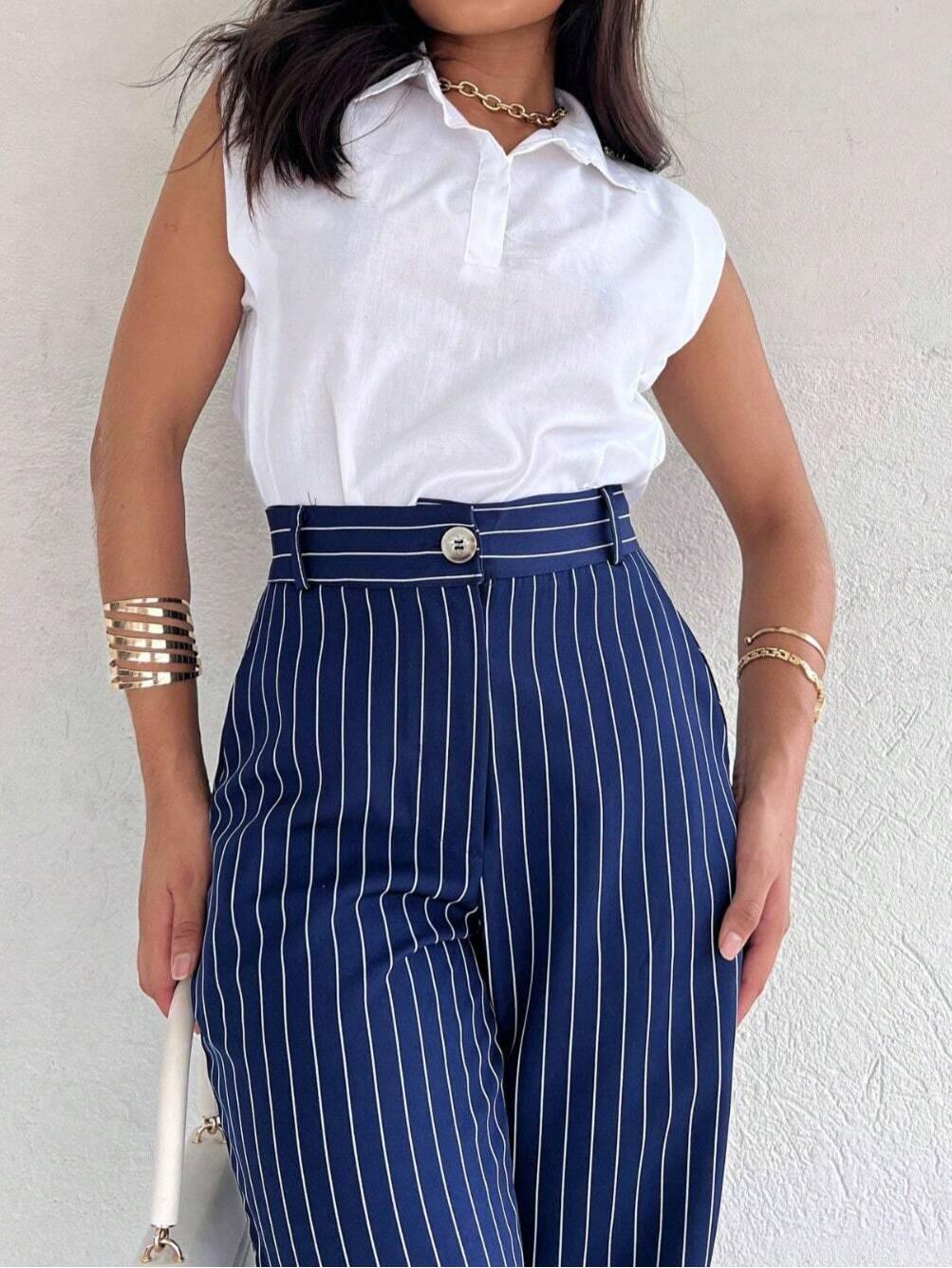 Feita em tecido premium de alfaiataria, sua modelagem estruturada alonga a silhueta e garante um ajuste perfeito, enquanto a estampa listrada em preto clássico adiciona um toque moderno e versátil. Seja para um look formal de trabalho, um evento especial ou um outfit casual chic, esta calça entrega presença e sofisticação em qualquer ocasião.